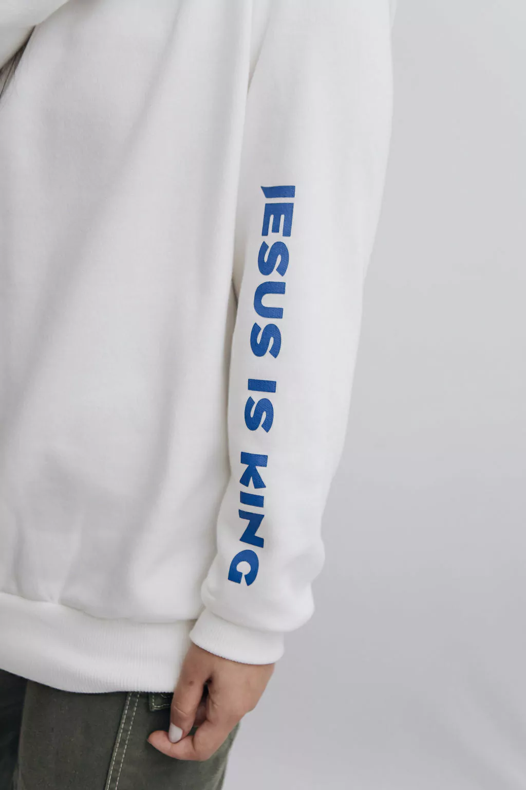 O Crewneck Apriori Offwhite é composto por algodão e poliéster, proporcionando conforto e durabilidade. A peça é projetada com um ajuste relaxado no corpo e nas mangas. A estampa exclusiva “Jesus is King” é vista nas mangas. Detalhes funcionais incluem gola e barra em ribana canelada, e reforço de ombro a ombro.
